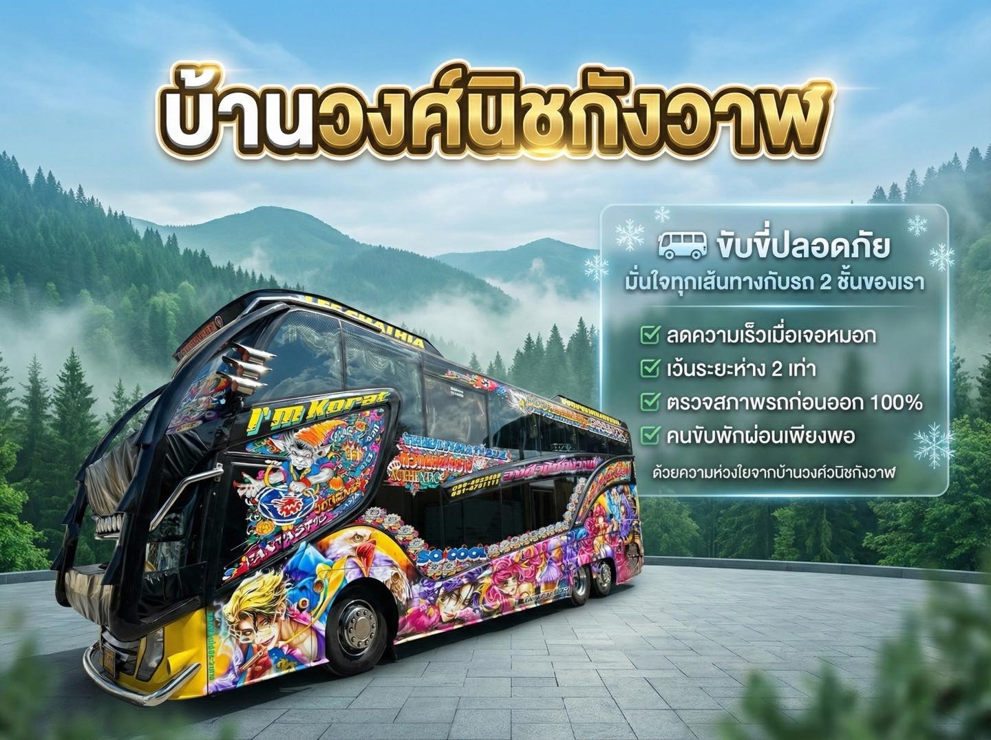 รถใหม่ มาตรฐานสากล ได้รับรอง ISO 9001 & ISO 39001 " ประสบการณ์ดำเนินงานกว่า 20 ปี Top 5 รถนำเที่ยวประเทศไทย บริการด้วยใจ มี Service Mind ได้รับรองมาตรฐาน Q Bus กรมการขนส่งทางบก ได้รับรองมาตรฐาน Standard Bus for Tourism กรมการท่องเที่ยว